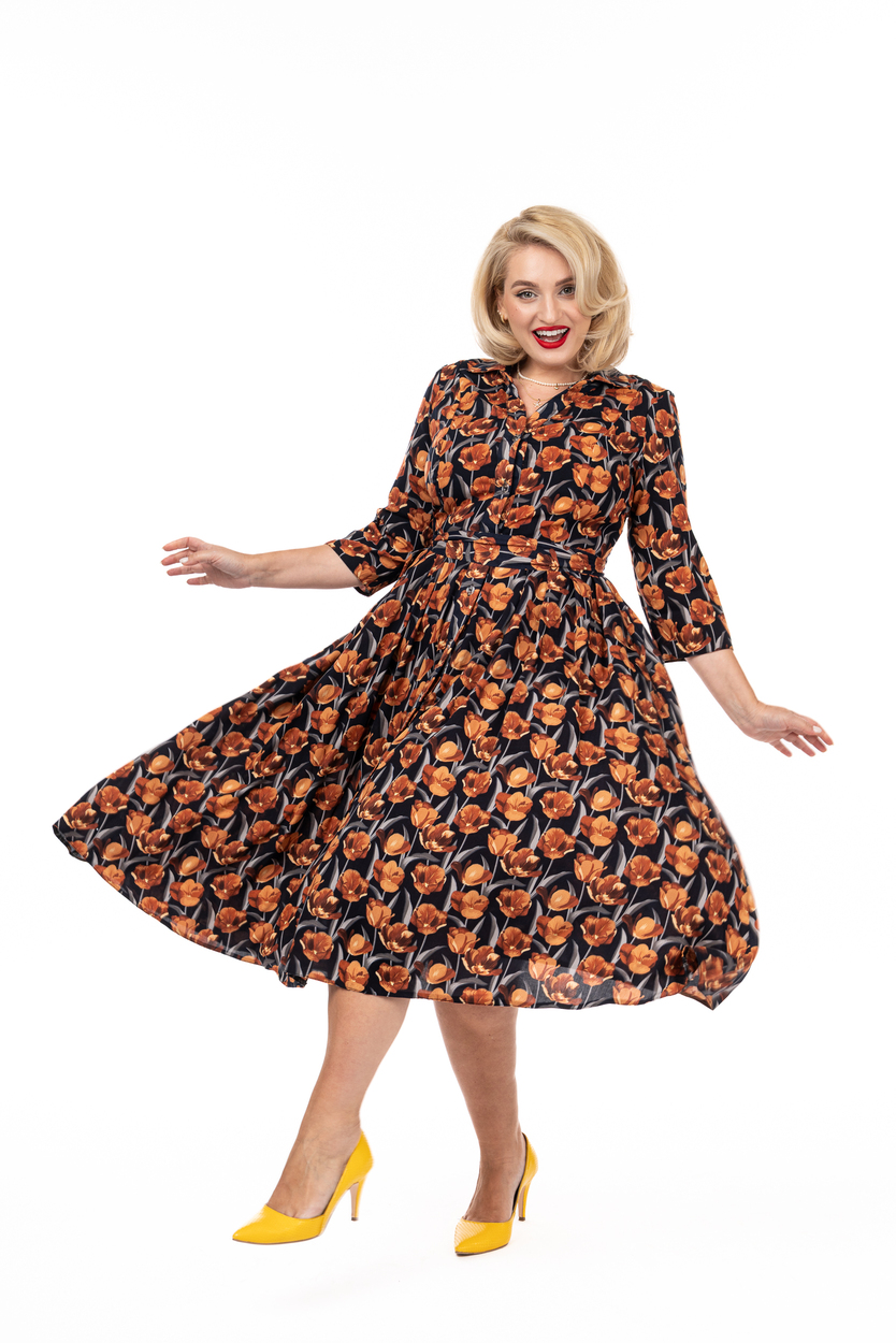 Rochia DORINA din bumbac cu lalele de toamnă subliniază talia și se potrivește pe orice formă de corp pentru că flatează orice siluetă indiferent de măsură. În alegerea mărimii trebuie să vă ghidati după circumferință bustului măsurată peste sutien și circumferința taliei măsurată o palmă deasupra buricului în cel mai îngust punct. Rochia are 2cm lărgime pentru ca să ofere lejeritate nasturilor atunci când stăm jos.
